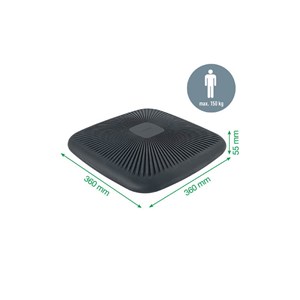 ergonomický balanční vzduchový polštář s certifikací IGR, zmírňuje tlak na páteř a zlepšuje krevní oběh, moderní a minimalistický design, čtvercový tvar pro lepší ergonomii díky zvětšené sedací ploše v porovnání se standardními kulatými polštáři a intuitivní správné polohování na židli, rozměry 360 x 360 x 55 mm