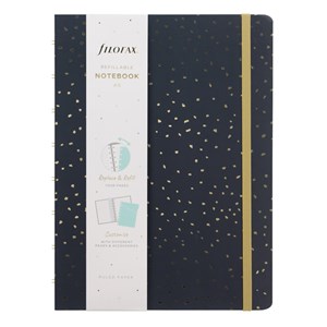 S tímto plnitelným zápisníkem Filofax Notebookem A5 z naší kolekce Confetti v provedení Charcoal bude každý Váš den mimořádný. Zápisník obsahuje pevné laminované kartonové desky s detaily ze zlaté fólie a vzorovanou vnitřní stranou desek. Jeho zlatá dvoudrátová vazba umožňuje Notebooku ležet úplně rovně a barevně sladěné elastické zavírání vám pomůže udržet vše na svém místě. Uvnitř zápisníku najdete linkované stránky vhodné i pro plnicí pera. Stránky můžete libovolně přemísťovat a nebo doplňovat. To Vám umožní vytvořit si zápisník, který opravdu vyhovuje Vašim potřebám. Využít navíc můžete naši širokou nabídku náplní a příslušenství.
