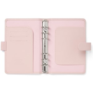 diář Saffiano osobní, modrá barva, jednoduchý a sofistikovaný design, desky z imitace kůže s jemnou strukturou a dvojtónovým efektem, zavírání na pásek s patentem, poutko na pero, náplň Classic, papír vhodný pro plnicí pera 80 g/m², nedatovaný roční plánovač, úvodní stránka, rozřazovače, linkované, čisté a tečkované papíry, kontakty, seznam úkolů, barevné linkované papíry, pravítko / záložka, levá strana: 3 kapsy na karty, 1 větší kapsa, elastické poutko na pero, pravá strana: kapsa na poznámkový blok, kroužková mechanika 23 mm, výška 188 mm, šířka 135 mm, hloubka 35 mm
