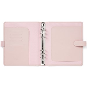 diář Saffiano A5, jednoduchý a sofistikovaný design, desky z imitace kůže s jemnou strukturou a dvojtónovým efektem, zavírání na pásek s patentem, poutko na pero, náplň Classic, papír vhodný pro plnicí pera 80 g/m², nedatovaný roční plánovač, úvodní stránka, rozřazovače, linkované, čisté a tečkované papíry, kontakty, seznam úkolů, barevné linkované papíry, pravítko / záložka, levá strana: 5 kapes na karty, 1 větší kapsa, elastické poutko na pero, pravá strana: kapsa na poznámkový blok, kroužková mechanika 30 mm, výška 236 mm, šířka 210 mm, hloubka 44 mm