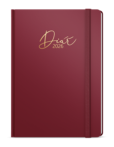 povrch diáře z matného nepoškrabatelného lamina se zlatou ražbou, rovný hřbet, zakulacené rohy, gumička v barvě diáře, , české a slovenské jmenné kalendárium, mezinárodní svátky, měsíční fáze, roční období, letní a zimní čas, místo na poznámky, formát 12 x 16,5 cm