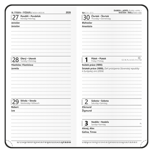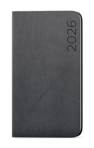 jemný materiál (imitace semiše), jednostranná výplň desek, ražba roku, rovný hřbet, zakulacené rohy, české a slovenské jmenné kalendárium, dny a měsíce v 5 jazycích (CZ, SK, ANG, D, R), mezinárodní svátky, měsíční fáze, roční období, letní a zimní čas, místo na poznámky, formát 7,5 x 15 cm