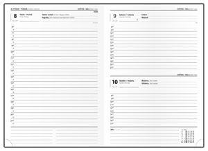 povrch diáře příjemný na dotek, zářivé barvy, moderní design, české a slovenské jmenné kalendárium, dny a měsíce v 5 jazycích (CZ, SK, ANG, D, R), mezinárodní svátky, měsíční fáze, roční období, letní a zimní čas, místo na poznámky, formát 14,3 x 20,5 cm