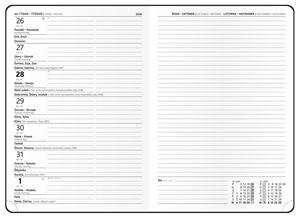povrch diáře příjemný na dotek, měkké desky, kulaté rohy, uzavírání na gumičku, praktické provedení týdenního kalendária a poznámkového bloku, české a slovenské jmenné kalendárium, dny a měsíce v 5 jazycích (CZ, SK, ANG, D, R), mezinárodní svátky, měsíční fáze, roční období, letní a zimní čas, místo na poznámky, formát 14,3 x 20,5 cm