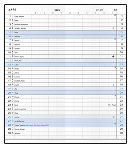 Kód: 586690 Dostupnost Diář kapesní PVC - měsíční / černá materiál PVC, české měsíční jmenné kalendárium, měsíční fáze, roční období, letní a zimní čas, osobní záznamy, plánovací kalendář, místo na poznámky, přehled státních svátků, formát 7,9 x 17,9 cm 29,00 Kč bez DPH Dostupnost: Dostupné Množství: Přidat do košíku Podrobnosti materiál PVC, české měsíční jmenné kalendárium, měsíční fáze, roční období, letní a zimní čas, osobní záznamy, plánovací kalendář, místo na poznámky, přehled státních svátků, formát 7,9 x 17,9 cm