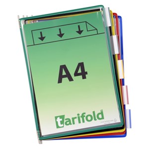 nerozbitný flexibilní odolný rámeček s kapsou, oboustranný pro systémy Tarifold, vyztužený ocelovým drátem, rychlé upevnění kovovými úchyty, vhodný do průmyslu, chrání dokumenty před nečistotami a vlhkem, snadná výměna dokumentů, efektivní organizace dokumentů A4, formát A4 otevřený shora, antireflexní odolné PVC, 5 indexových záložek, balení 10 ks