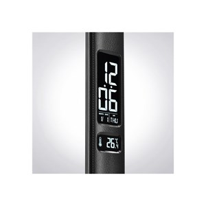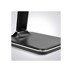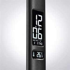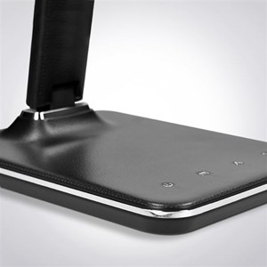 stolní lampička s LED světelným zdrojem a designem černé kůže, možnost volby 3 barev světla – teplá, neutrální bílá a studená bílá (3000K-6000K), stmívatelná – 5-stupňové stmívání, displej s funkcí času, kalendáře, budíku a teploměru, příkon světla: max. 9W, světelný tok: max. 500lm, úhel svícení: 120°, protiskluzová základna s dotykovým vypínačem, napájení: AC 100-240V, rozměr: 116x181x410mm, délka napájecího kabelu: 140cm, LED zdroj nelze měnit