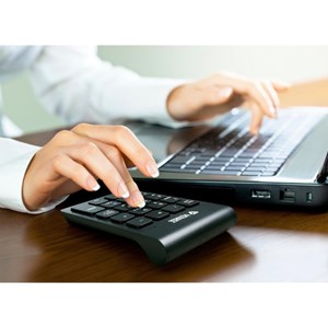 nejlepší řešení pro notebooky, které nemají integrovanou numerickou klávesnici, díky redukci TYPE-C, která je součástí balení, lze tuto klávesnici připojit k notebookům s porty USB A a USB C, kompaktní velikost a štíhlý design vám ušetří místo a zajistí pohodlné použití v kanceláři, služební cestě nebo na obchodních jednáních, připojení bezdrátové, dosah do 10 m, rozměry 133 x 86 x 20 mm, hmotnost 90 g