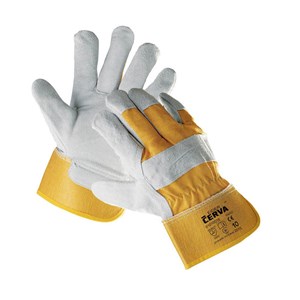 rukavice z jednoho kusu silné hovězí štípenky v dlani s podšívkou, bavlněné tkaniny na hřbetu, s bavlněnou vyztuženou manžetou, celokoženými palci a ukazováčky a překrytými špičkami prstů, ochranné rukavice proti mechanickým rizikům