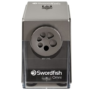 elektrické ořezávátko Swordfish Omni, profesionální pro školy i kanceláře, pevná konstrukce, rychlé ostření, spirálová fréza, nastavení hrotu pomocí páčky: ostrý hrot pro psaní a technické kreslení, střední hrot pro univerzální použití, tupější hrot pro bezpečné řešení pro děti, vhodné pro různé věkové skupiny a typy výtvarných potřeb, jedno ořezávátko pro všechny typy tužek 6–12 mm, zvládá standardní tužky 6, 7, 8 mm, silné pastelky a grafitové tužky 9–12 mm, ideální řešení pro školní třídy, školky, výtvarné učebny a kanceláře