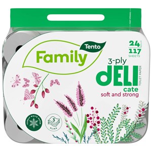 Tento Family Delicate je vysoce kvalitní, měkký a pevný toaletní papír, jeho dokonalá bělost a elegantní design zaručí vaší koupelně něžnou eleganci, velké balení 24 rolí, 3vrstvý toaletní papír, bez přidané vůně, 117 útržků
