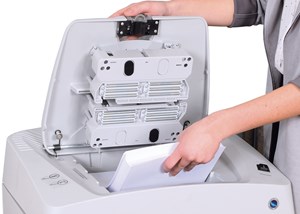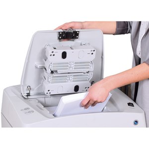 Skartovací stroj s automatickým podáváním na 350 listů nabízí manuální vstup na 10–12 listů. Vstupní šířka je 240 mm. Velikost řezu činí 3,5 × 40 mm. Stupeň utajení odpovídá úrovni P-4. Objem koše je 40 litrů. Rozměry zařízení jsou 390 × 360 × 640 mm. Stroj skartuje papír, kancelářské sponky i plastové karty. Je vybaven praktickým výsuvným košem pro snadnou manipulaci. Úsporný režim přepne zařízení po 12 vteřinách nečinnosti do stand-by režimu. Díky systému Oil Free není třeba řezné nože promazávat ani čistit. Délka nepřetržité skartace je non-stop.