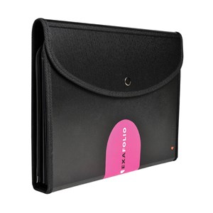 vícedílná zakládací spisovka s přihrádkami na dokumenty ve formátu A4, které jsou navíc opatřeny popisovatelnými záložkami pro jednoduchou identifikaci, pouzdro navíc obsahuje kroužkový blok A4, kapsy na drobné dokumenty, CD/DVD, vizitky, mobilní telefon nebo tablet, 3 poutka na propisky, uzavírání na druk, vyrobeno z extrasilného a odlehčeného polypropylenu