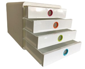 atraktivní box s duhovými detaily, umístění na stůl nebo zavěšení na stěnu, prostorné uzavřené lesklé zásuvky chrání dokumenty proti prachu a zachovávají důvěrnost, kombinovatelný s řadou Iderama, vhodný pro kanceláře, home office i školy, A4 maxi, rozměry 278 × 267 × h 347 mm, materiál PS, orientace na výšku, vkládání A4 kratší stranou, bílý korpus, 4 barevné zásuvky, lehký, odolný, stohovatelný, záruka 25 let