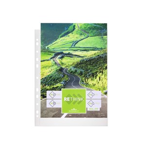 obaly na prospekty z polypropylenu s ochranou dokumentů před vyblednutím, vyrobeno minimálně z 95 % z recyklovaného plastu před použitím (průmyslový odpad, odřezky nebo zbytky z výroby), prémiová kvalita, formát A4 na výšku